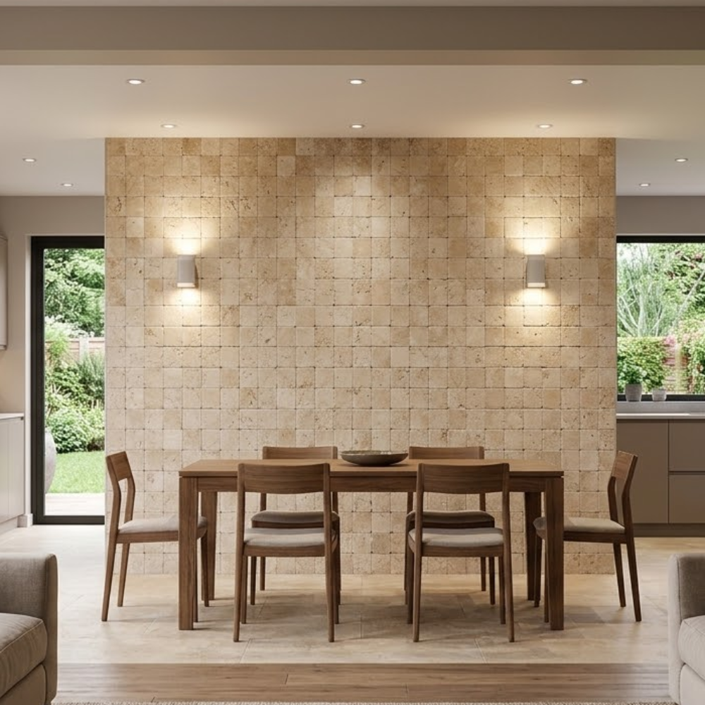 Nobreza Importada: Diferencia-se pela tonalidade e formação geológica icônica do Travertino Romano original.