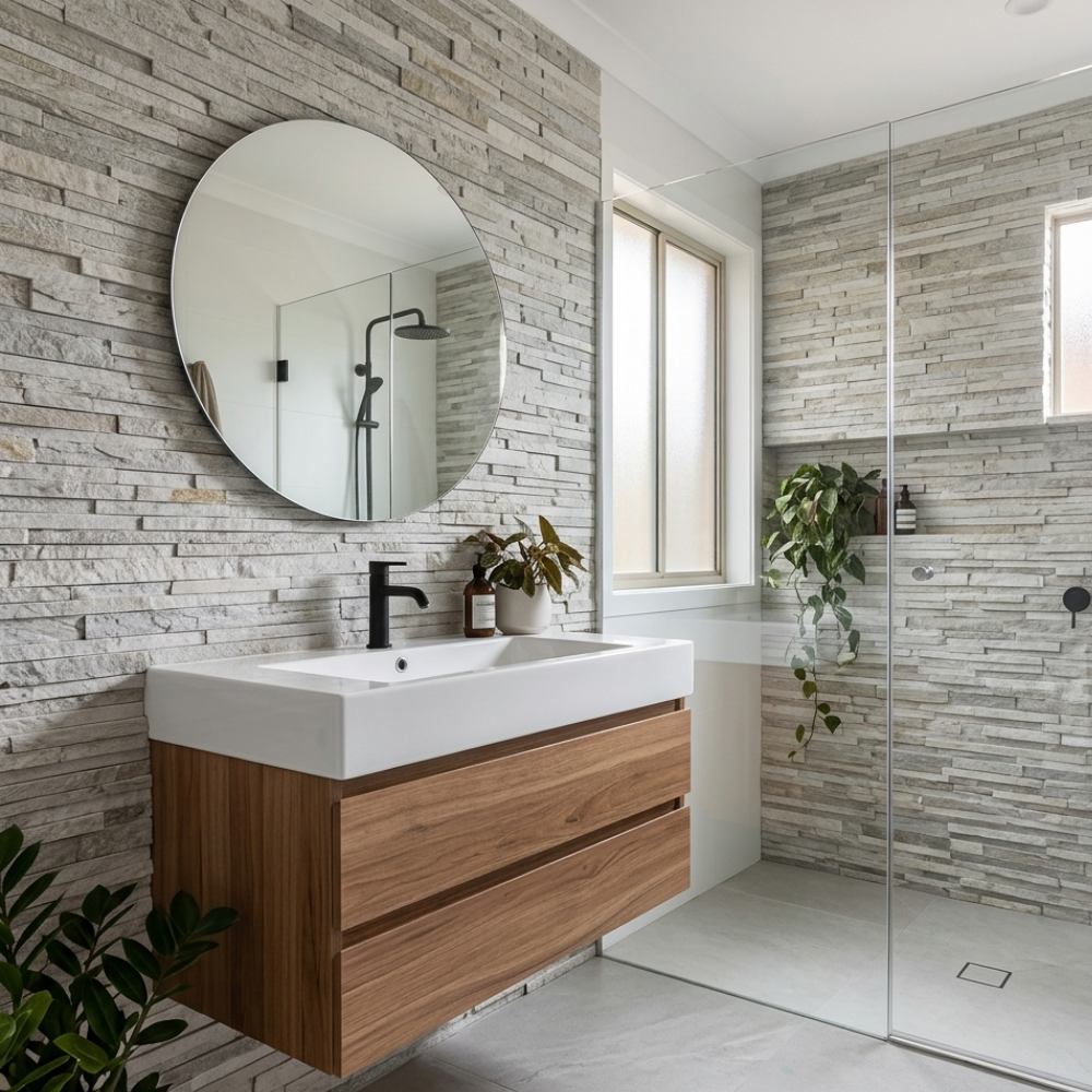 Dica Revest: Exclusivo para revestimentos verticais que exigem alto impacto. Em paredes de pé direito alto ou fachadas principais, utilize iluminação direcionada de baixo para cima para maximizar o relevo e a sofisticação rústica da Pedra São Thomé.