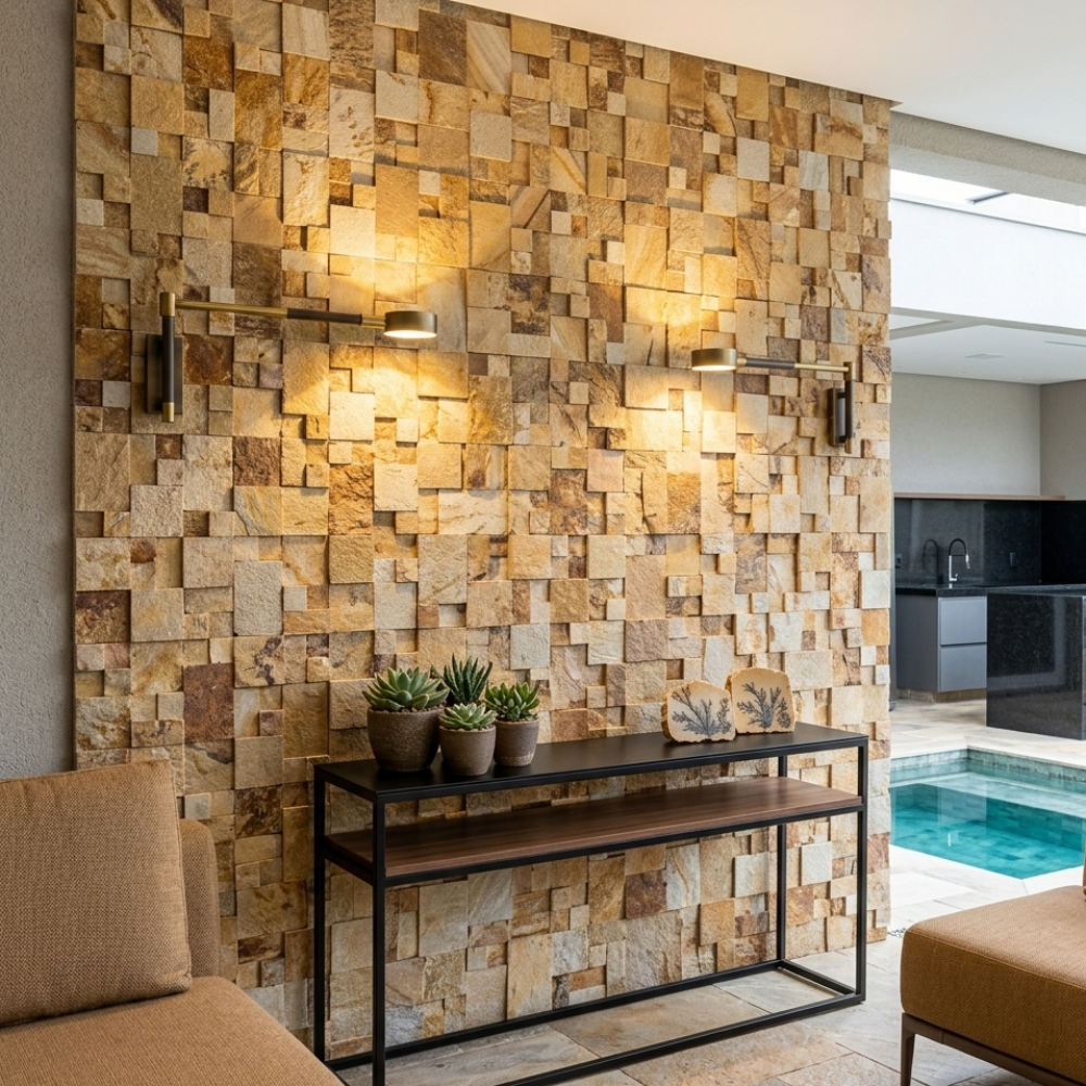 • Visual Uniforme e Moderno: A composição com pedras de mesmo tamanho cria uma estética organizada que transmite sensação de ordem, amplitude e sofisticação “clean”.