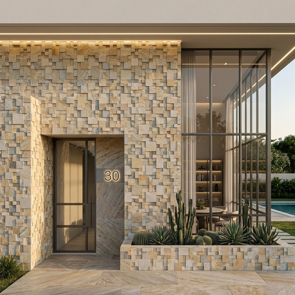 Dica Revest: Perfeito para áreas de relaxamento. O relevo das peças menores cria um jogo de luz e sombra suave que ganha ainda mais vida com iluminação direcionada ou sob a água de cascatas.