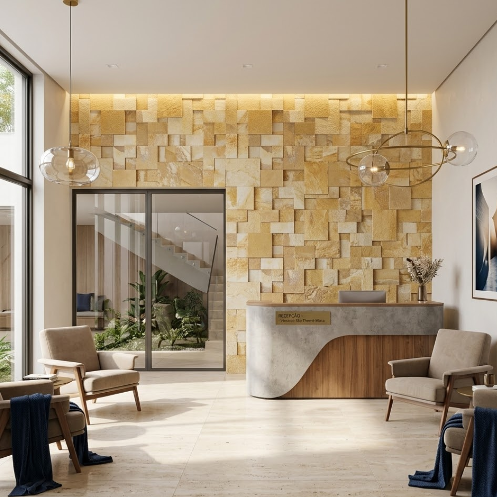O Mosaico Telado São Tomé é a solução inteligente para quem busca a nobreza do quartzito com a rapidez de uma instalação moderna. Composto por peças de pedra natural pré-fixadas em telas de 30×30 cm, este revestimento garante um alinhamento perfeito e acabamento uniforme, trazendo a luminosidade e a propriedade atérmica da pedra mineira para o seu projeto.