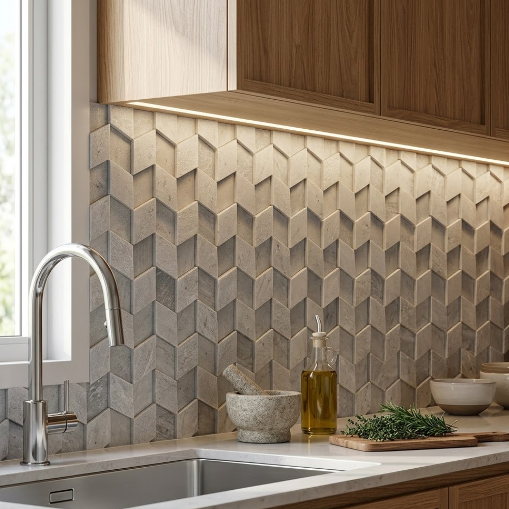Dica Revest: O revestimento favorito da arquitetura brasileira. Utilize o Mosaico Padrão em bordas de piscina e fachadas para garantir resistência total às intempéries; sua claridade natural ajuda a ampliar o espaço e traz a energia da pedra mineira para o interior de banheiros e áreas de bem-estar.