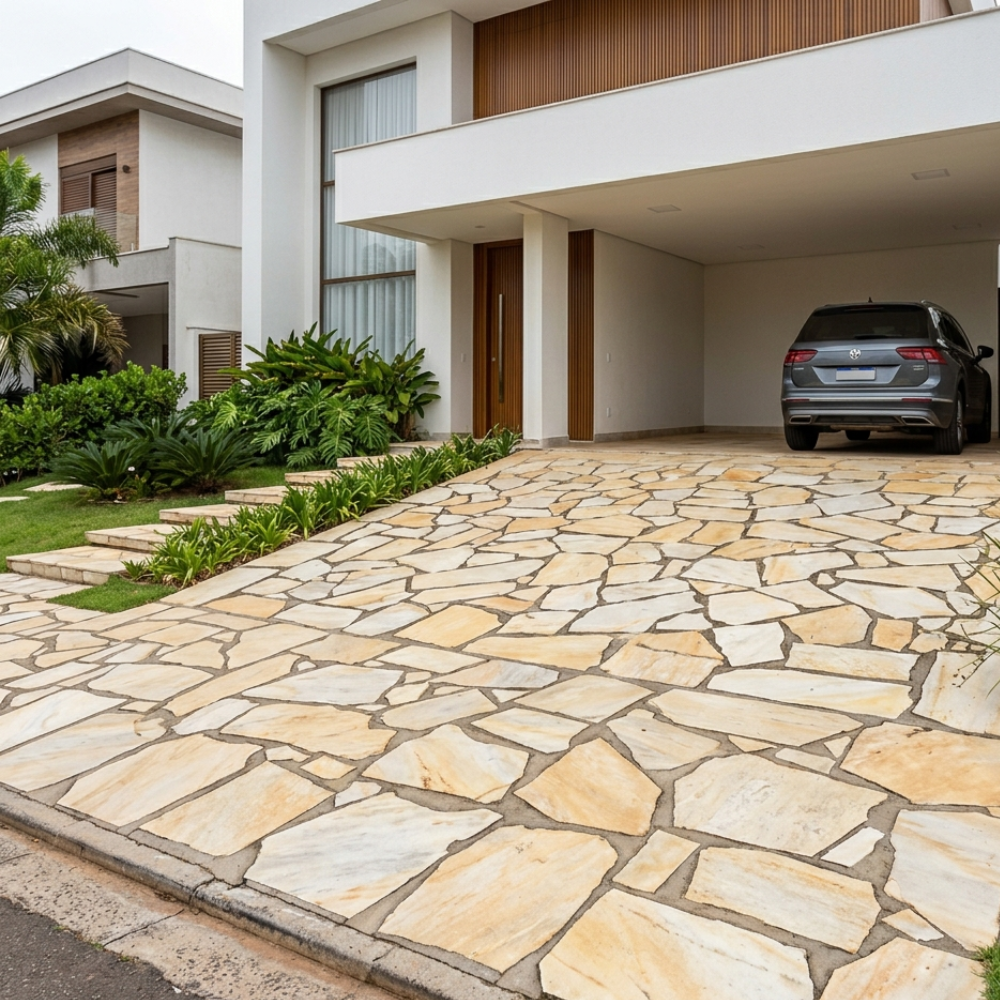 Aplicação: Pátios Amplos, Caminhos de Jardim (Passo Japonês), Garagens e Piscinas.