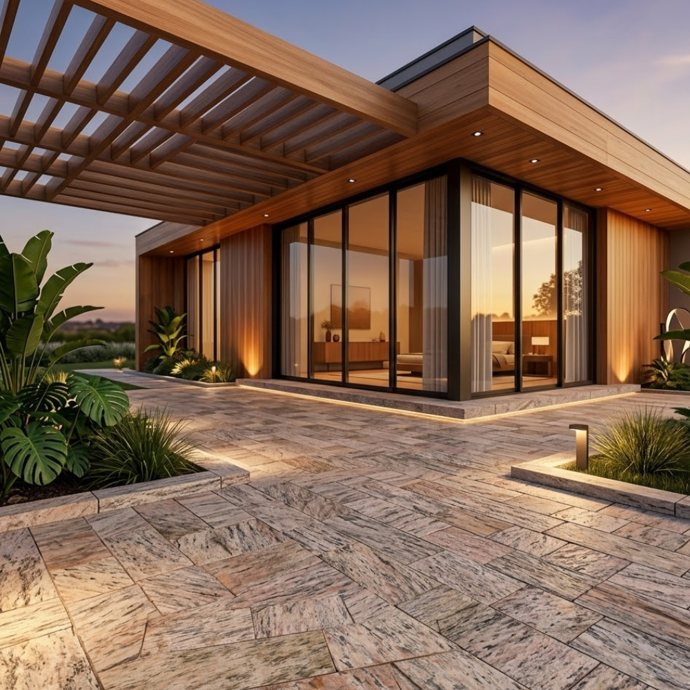 Segurança Total: Superfície naturalmente áspera que garante aderência máxima para pedestres e veículos, mesmo sob chuva.