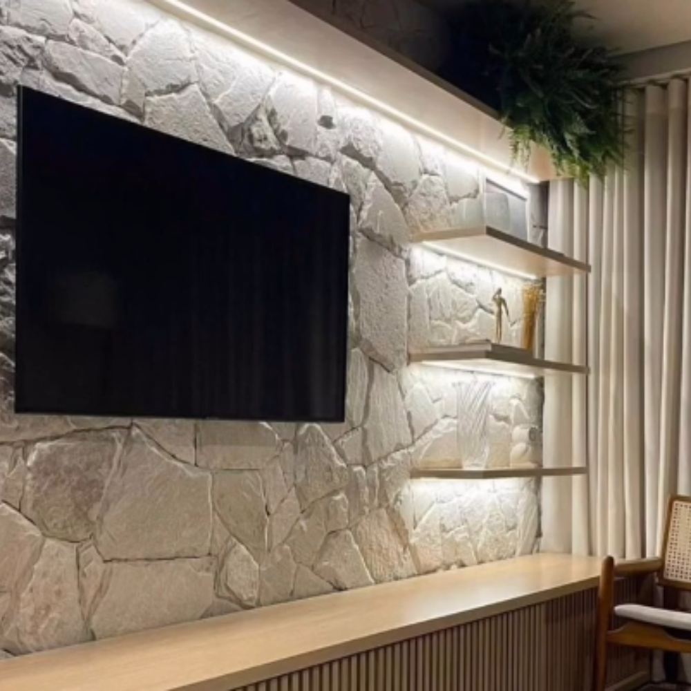 Dica Revest: Ideal para adicionar textura e personalidade sem “pesar” o ambiente. Em salas e halls, utilize iluminação indireta para que a textura semi-rústica ganhe vida, criando uma conexão profunda entre o design interior e a natureza.