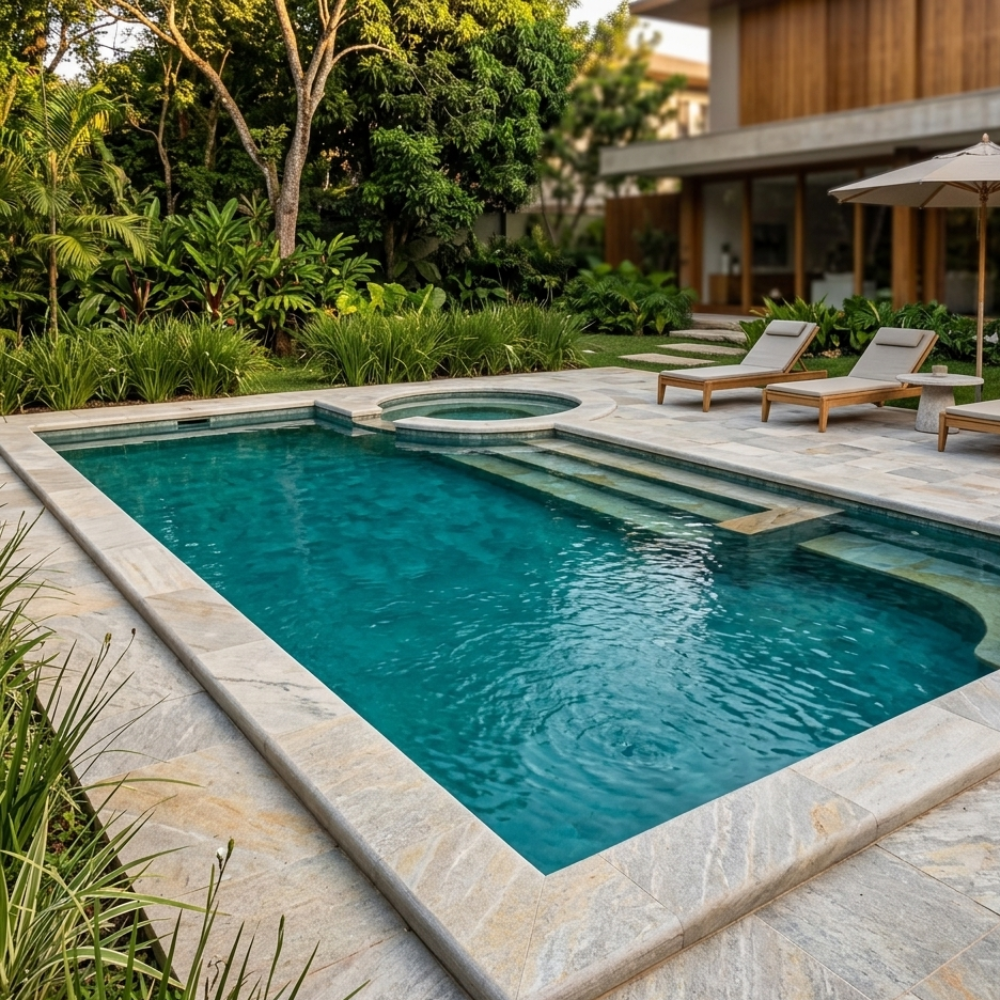 • Textura Antiderrapante: A face natural da pedra oferece aderência segura mesmo quando molhada, prevenindo escorregões no contorno da piscina.