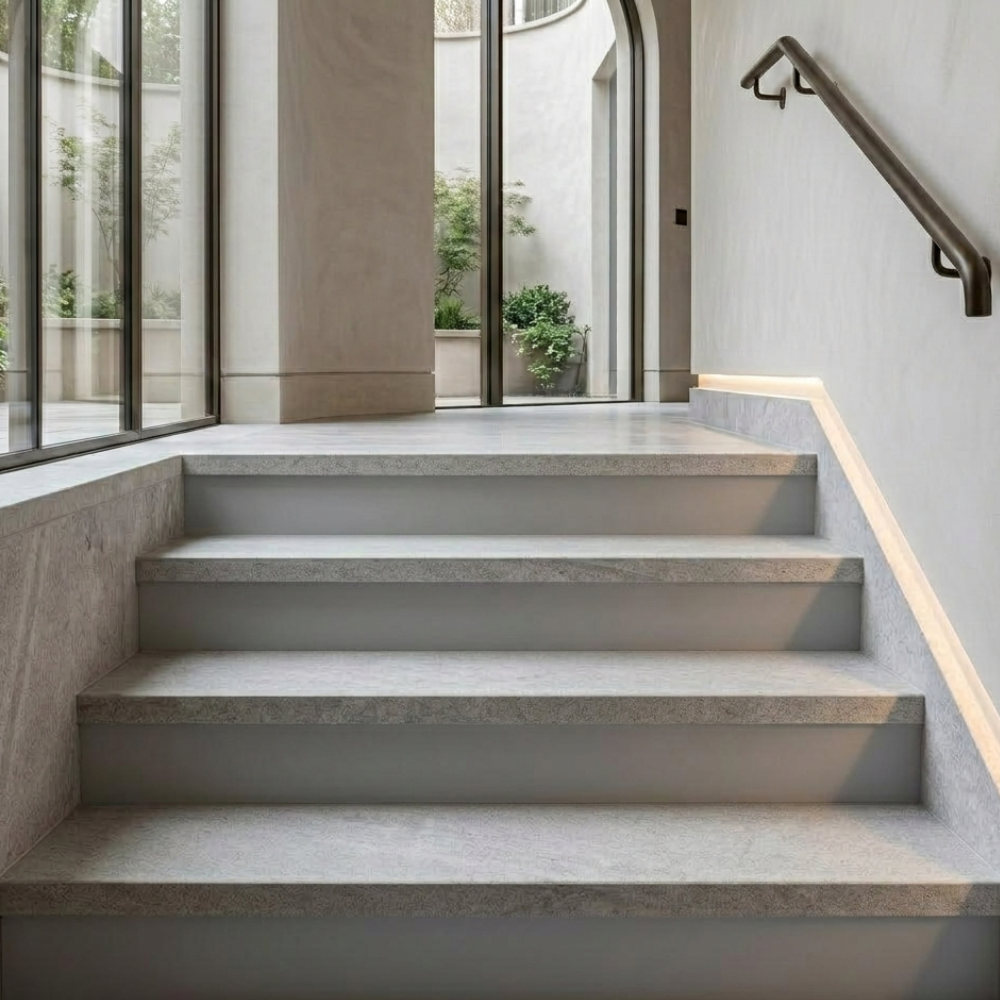 3. Soleiras e Espelhos (Corte Reto): Peças retificadas sem boleado, ideais para divisões de portas (soleiras) e a parte vertical dos degraus (espelhos).