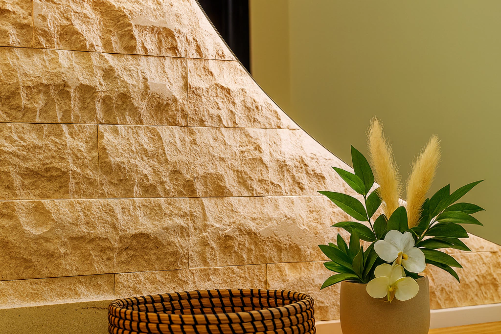 DICA DE INSTALAÇÃO REVEST: Para garantir o efeito de “parede esculpida”, recomendamos a instalação com junta seca (sem rejunte aparente). Isso enfatiza a continuidade das texturas e o formato Tamanho Livre, criando um painel orgânico, contínuo e sofisticado.