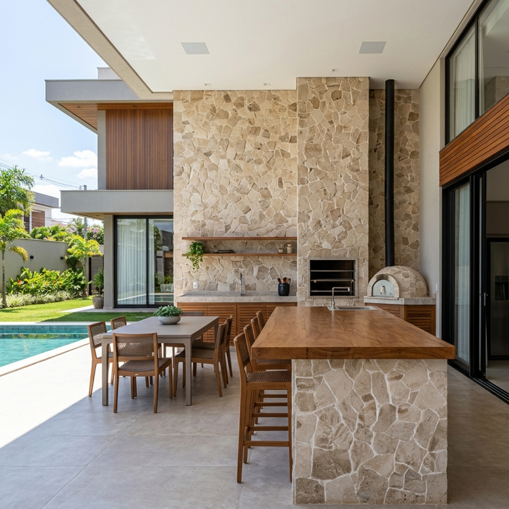 Estética Toscana Atemporal: A cor bege do travertino “aquece” o ambiente externo, harmonizando magnificamente com a luz do sol, o verde da vegetação e elementos em madeira.